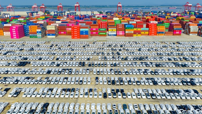 2025年10月4日在江蘇省港口集團(tuán)南京港龍?zhí)陡蹍^(qū)拍攝的準(zhǔn)備裝船出口的汽車(無(wú)人機(jī)照片)。新華社發(fā)(楊素平?攝)